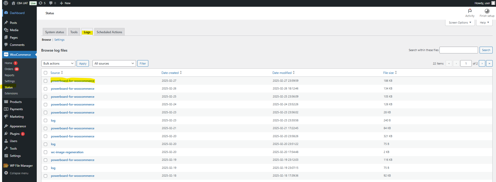 There is a daily file that is created that logs all requests made from the WooCommerce plugin to the PowerBoard API.
