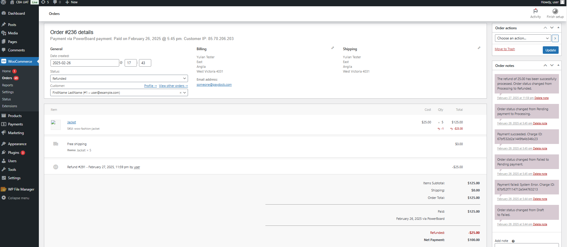 If any actions are performed directly within the PowerBoard dashboard (such as charge creation or refund), this will not be synced back to WooCommerce.
